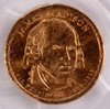 PCGS James Madison dollar obverse manganese layer missing before strike. The coin is copper colored on its obverse due to the outer manganese clad layer missing before strike. Scarce.