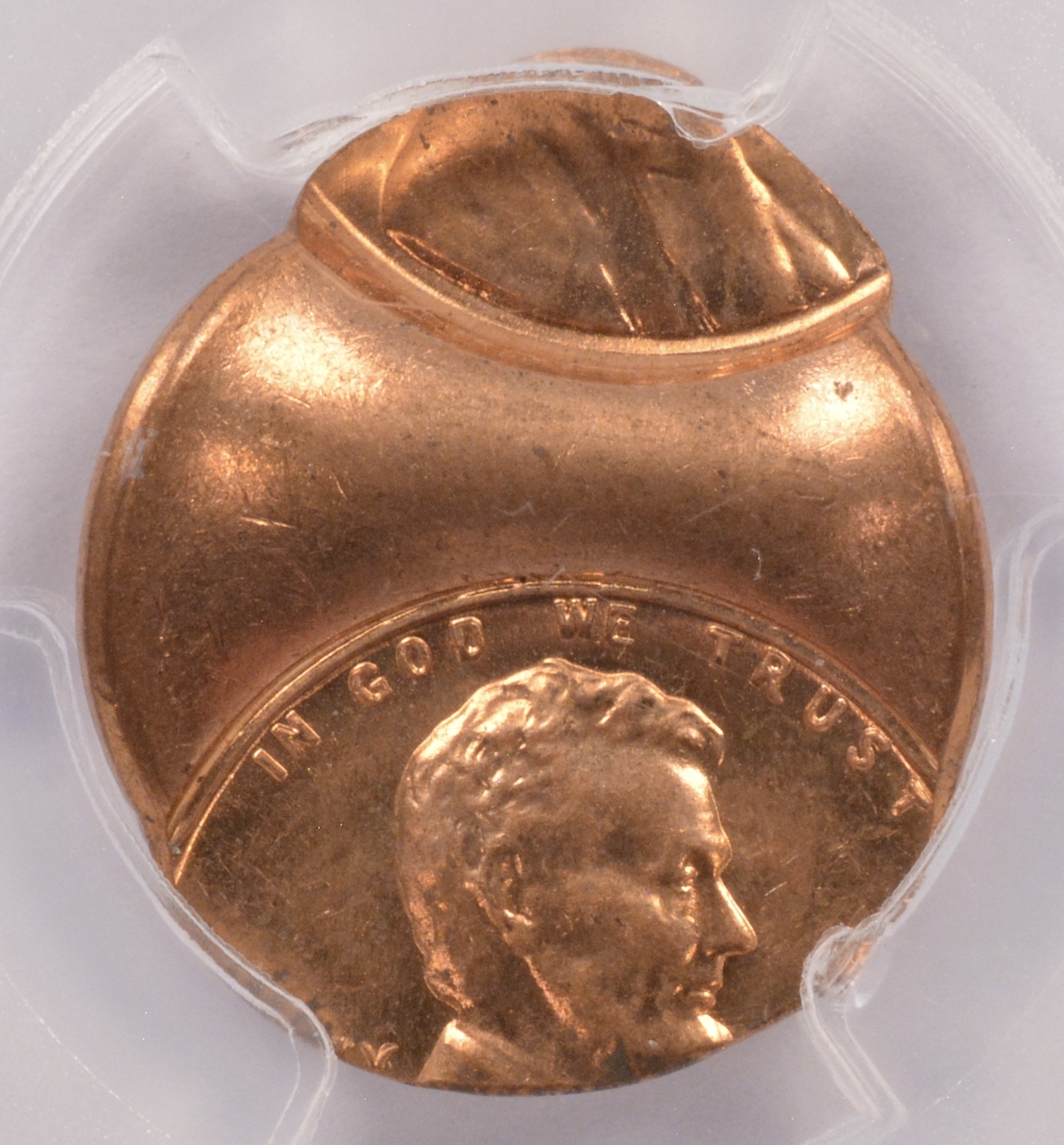 A foldover occurs when a coin is struck while on it's "edge" in the striking chamber, and when the dies come downward to "strike" the coin, they contact the edge, and bend the coin over into itself, creating a folded over planchet: a "foldover." Foldover strikes are scarce. Most are known on 1c coins, with about 100 examples known. Other series also have them known, such as 5c, 10c, and 25c coins, but they are very scarce, with perhaps 6-10 known for 5c and 10c, and only 1 or 2 for 25c.