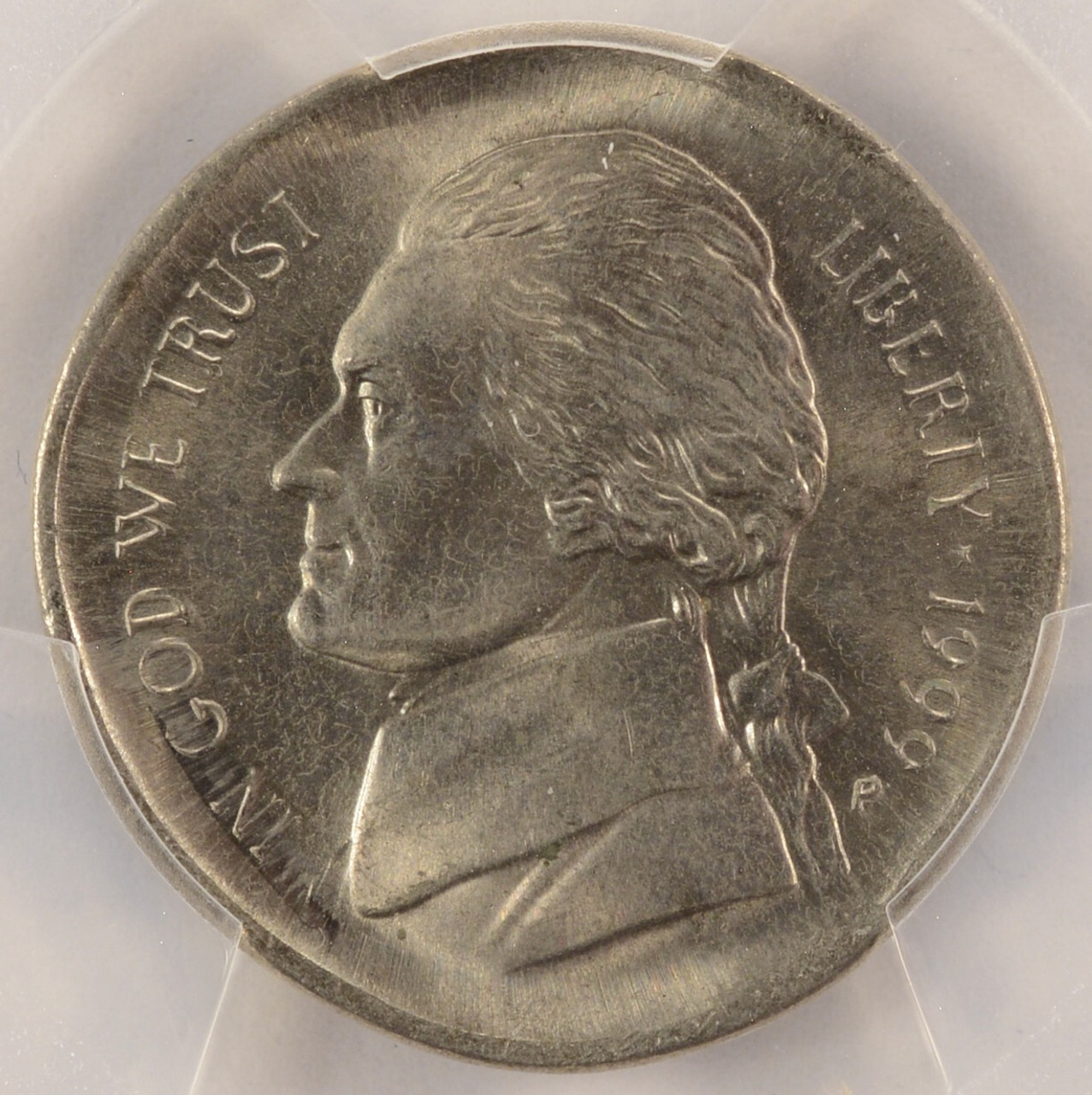 An off-metal (sometimes called a wrong planchet) is a coin struck on a planchet other than what it was intended to be struck on. The example coin about is a nickel struck on a Lincoln cent planchet. The metal and weight of the coin can be used to determine what planchet an off-metal is struck on. Off-metals almost always are coins struck on the same or smaller size coin's planchet (for example, a cent can be found struck on a dime planchet, but it is highly unlikely to find a dime struck on a cent planchet--this is because the planchet generally must be able to fit into the host coin's press.)