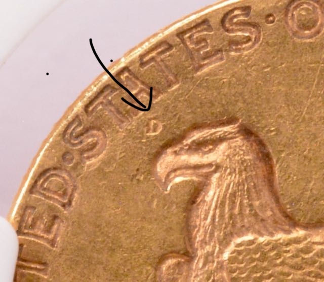 Above: a dropped die fill in the form of a "D" from the "D Mintmark" on this Indian $5.